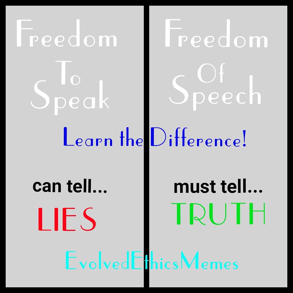 - Freedom of Speech gives no Right for an Individual to say anything they want; it is an "Oath to be the Orator of Truth." In Courtrooms across the Earth individuals take the Oath to "Tell the Truth, the Whole Truth and nothing but the Truth," under the Penalty of Punish for Lies - hence the term "Speech." Ethically, one is held to the Standards of Absolute Truth, when making a Speech in Public Forums, on Applications and clearly when one is called as Witness.